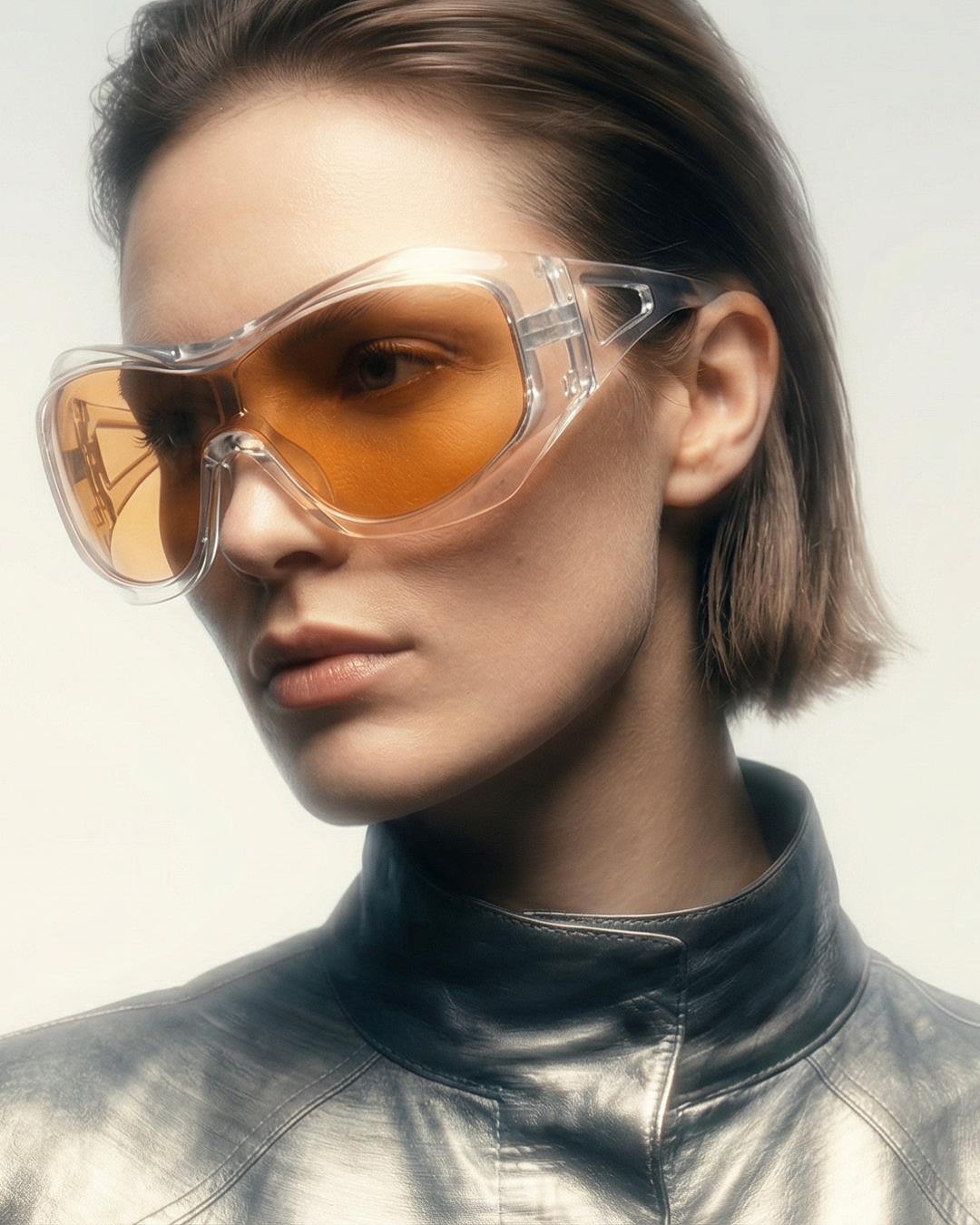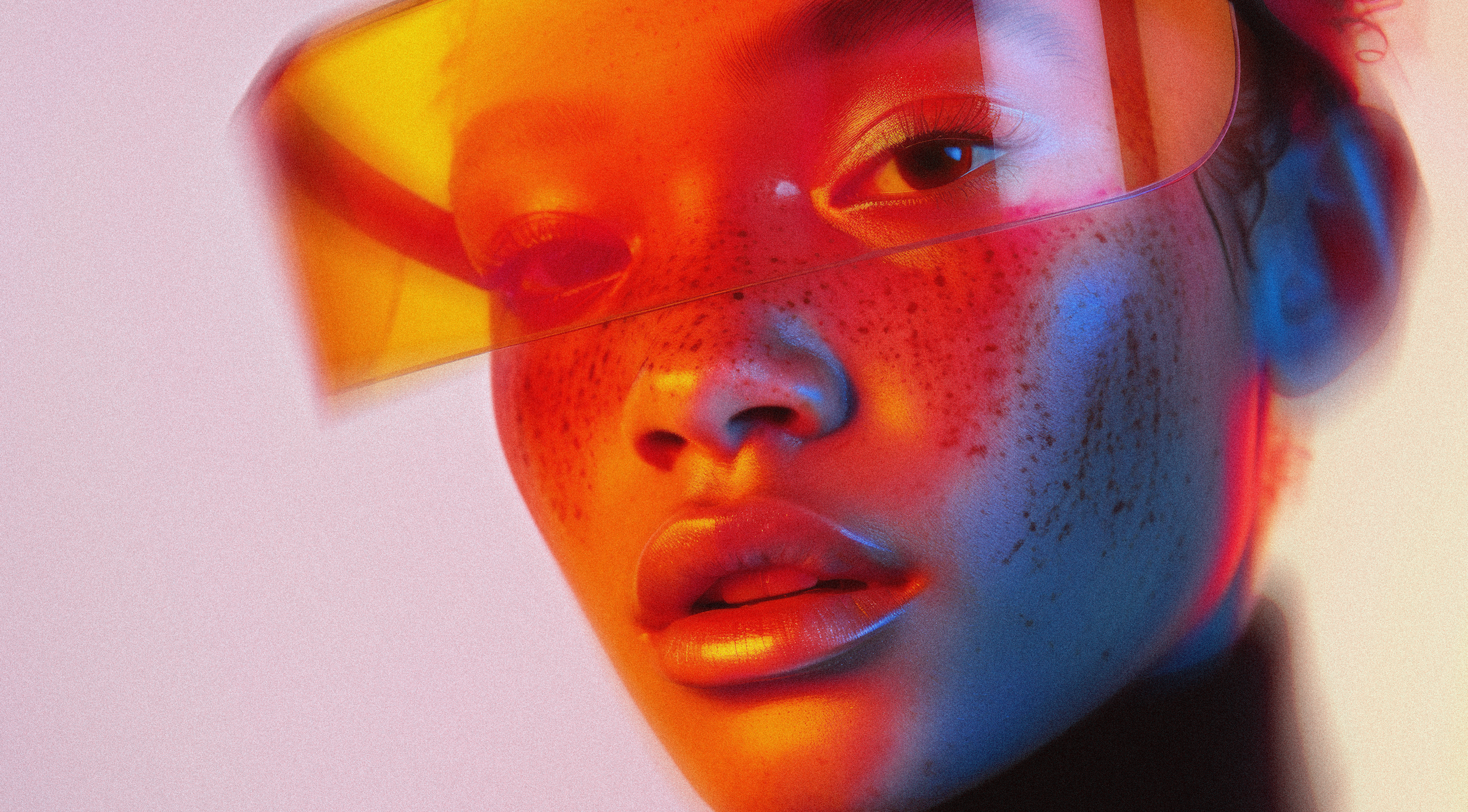 realistic medium full shot portrait of a 22-year-old woman with medium brown skin tone, warm undertones, naturally full lips, soft freckles, visible pores, real skin texture with micro-details, subtle imperfections, high-frequency detail, smooth glowy finish but not plastic, pastel color palette lighting, intense direct gaze, deep brown eyes, clean modern makeup, soft dramatic light shaping, cinematic highlight on cheekbones, hyper-realistic specular reflections, wearing a futuristic curved visor-style VR glasses, glossy black bar with transparent acrylic visor, highly saturated neon orange and yellow glow, strong neon reflections on skin, subtle light bloom, soft rim light around cheeks and jawline, elegant reflection patterns on visor surface, delicate motion blur light trails extending softly from the edges of the visor, gentle long-exposure streaks, floating illuminated dust particles, analog film grain and fine noise texture, subtle kinetic energy, smooth and elegant motion effect, realistic depth of field, ultra sharp focus on eyes and visor, slightly soft pastel gradient background, sleek modern sci-fi fashion mood, straight tight black turtleneck, hair pulled back cleanly, no messy flyaways visible --ar 16:9 --raw --v 6
