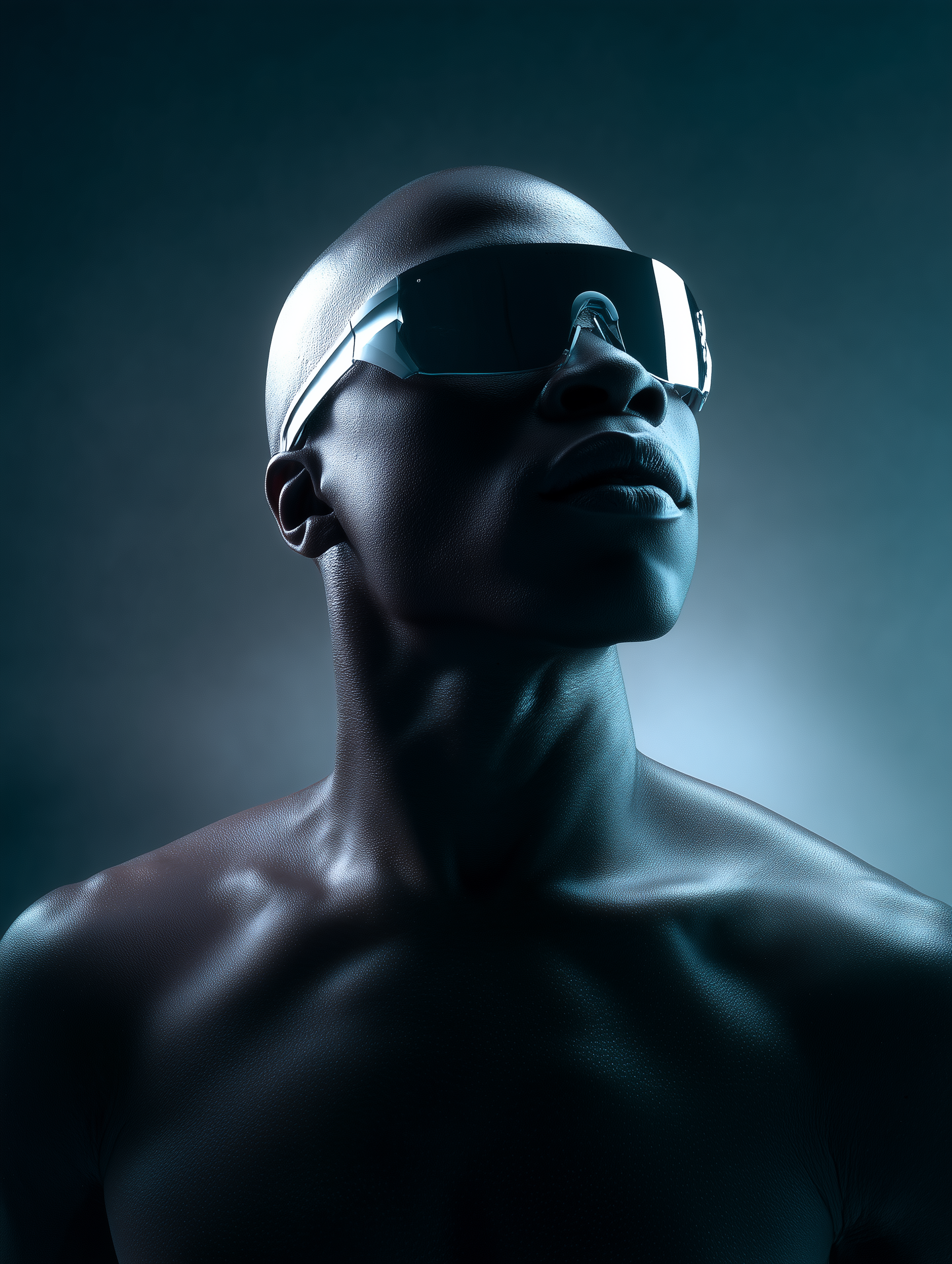 hyper-realistic cinematic portrait of a bald dark-skinned male figure wearing futuristic reflective metallic wraparound sunglasses, facing slightly upward in a confident pose. dramatic directional studio lighting with rimlight halo separating the silhouette from a deep desaturated blue-gray background. high-contrast glossy skin texture with realistic pores and specular highlights. sleek minimal cyber aesthetic, sculptural anatomy emphasized by sharp light falloff. reflective chrome eyewear catching abstract highlights, industrial sci-fi mood. clean composition, high-resolution, fine film grain, ultra-polished editorial photography style, powerful silent energy, cool monochromatic palette, minimalism, futuristic fashion portrait, 85mm lens shallow depth of field